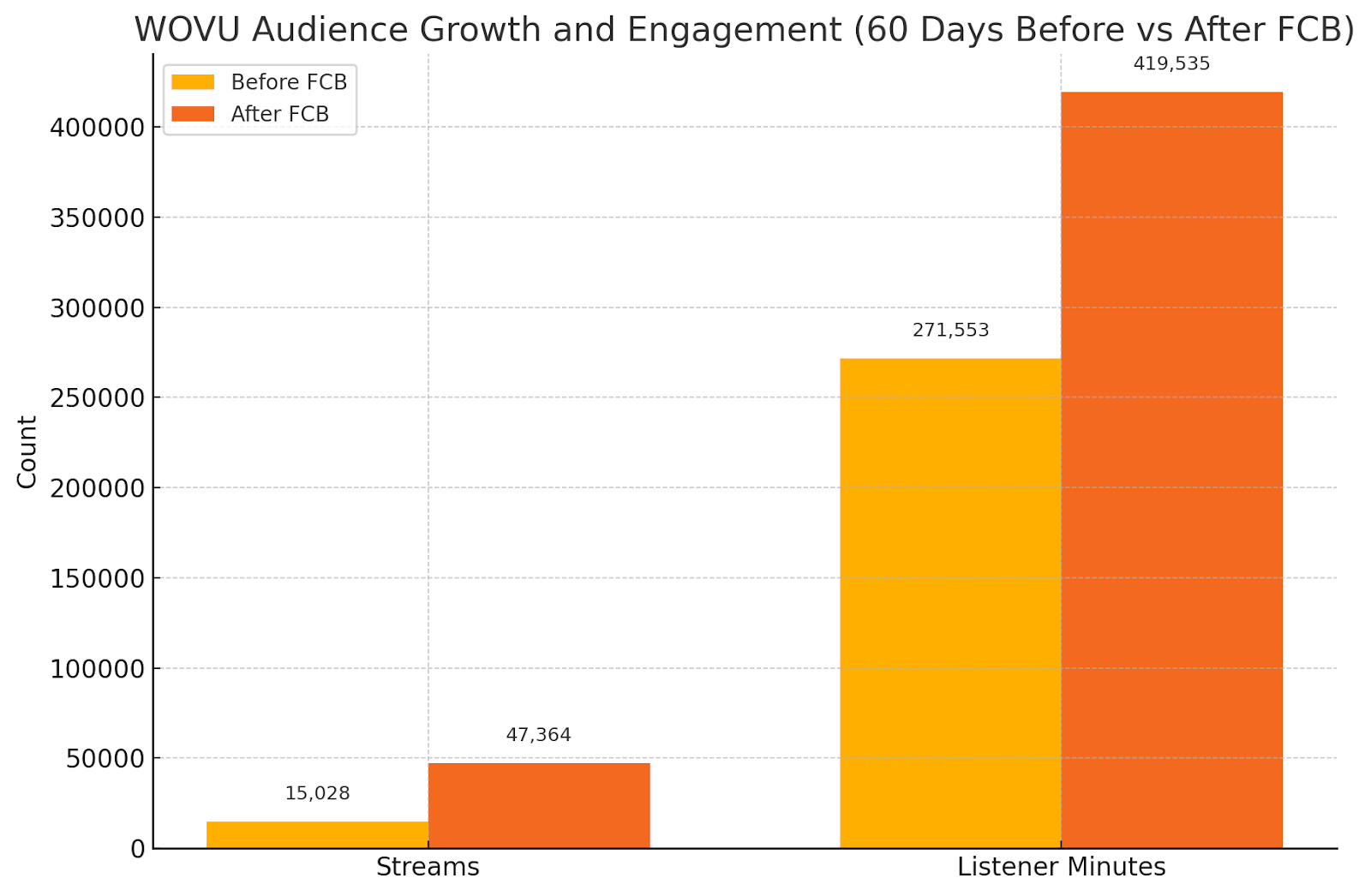 Streaming numbers jumped from 15,028 to 47,364 and listener minutes increased from 271,553 to 419,535 — proving that listeners aren’t just checking in, they’re staying longer.